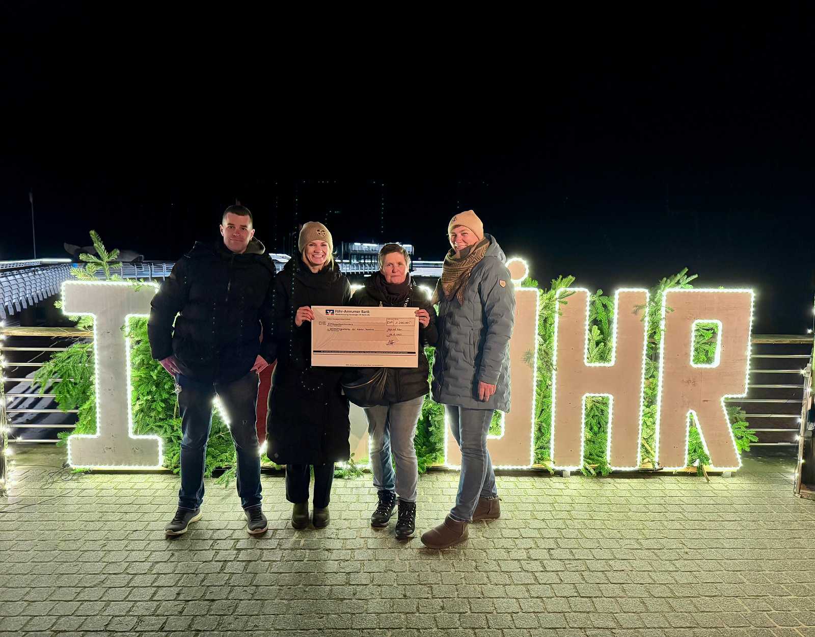 Jetzt folgte die freudige Scheckübergabe an der Mittelbrücke in Wyk – bei weihnachtlicher Stimmung und mit einem großartigen Ergebnis: 1.200 Euro für Föhrer Familien, die unsere Unterstützung brauchen.
